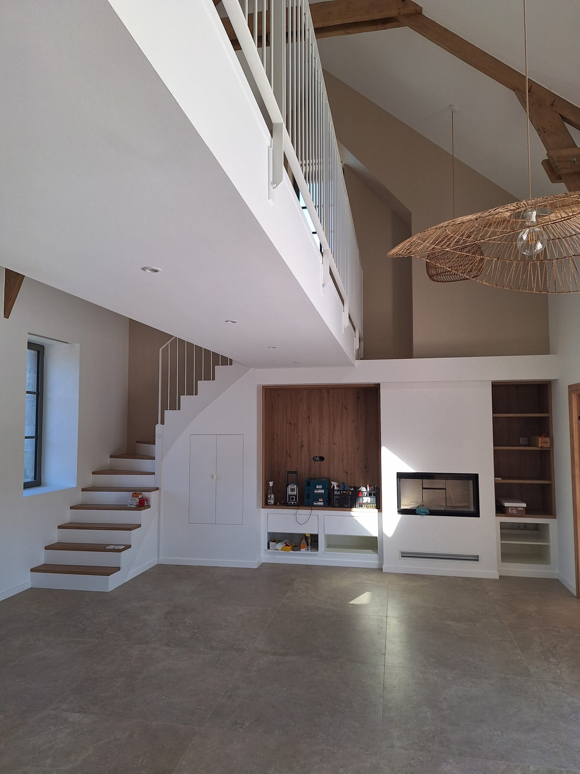 Nous avons protégé les sols, les menuiseries et les points sensibles pour travailler proprement. Puis, nous avons réalisé les rebouchages et les ratissages nécessaires, afin d’obtenir des fonds réguliers. Ainsi, la future finition gagne en profondeur, et la lumière se diffuse de façon plus homogène.